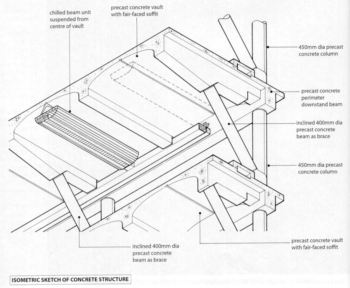 of the main office building consists of an exposed precast concrete frame (beams